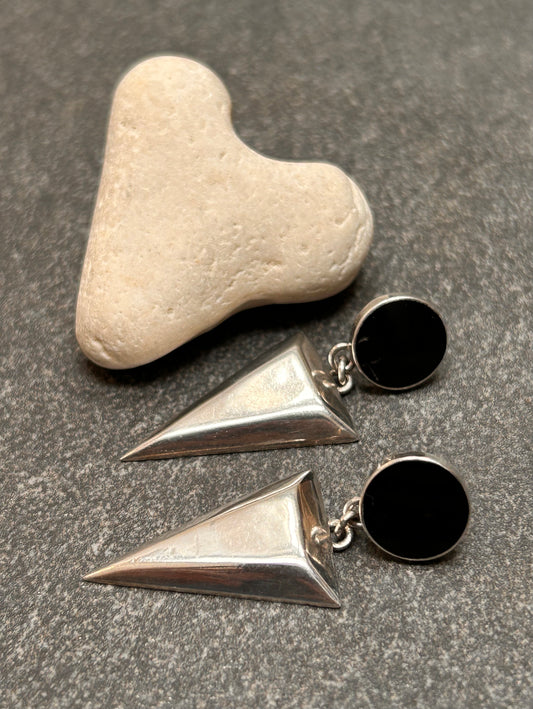 A pair of vintage sterling silver geometric drop earrings with a distinct 1980s aesthetic.