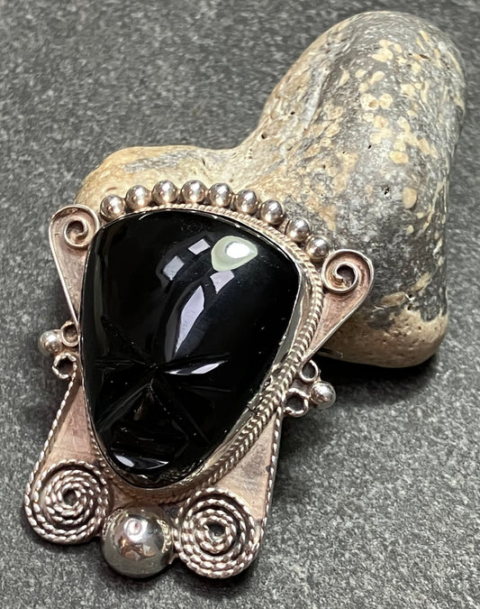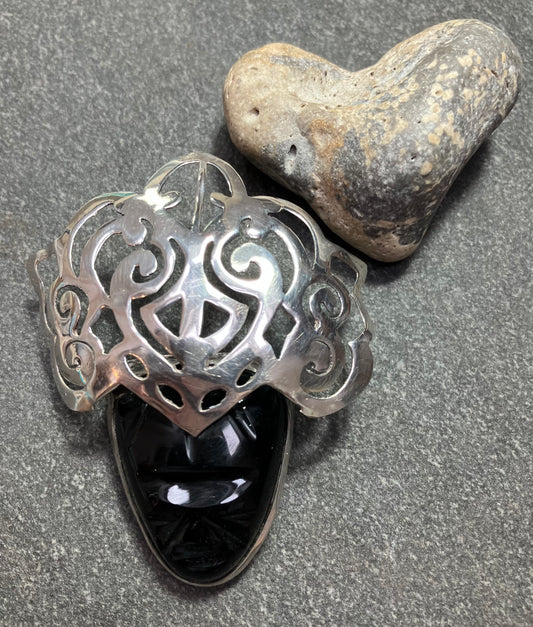 Vintage Mexican onyx and sterling silver warrior brooch.