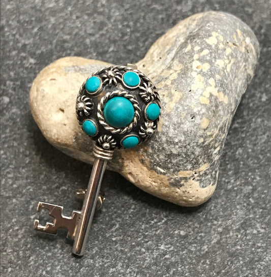Vintage sterling silver key brooch with lovely turquoise cabochons.