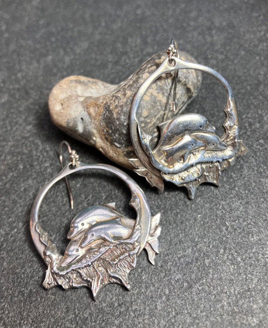 These are truly spectacular statement vintage sterling silver dolphin earrings.