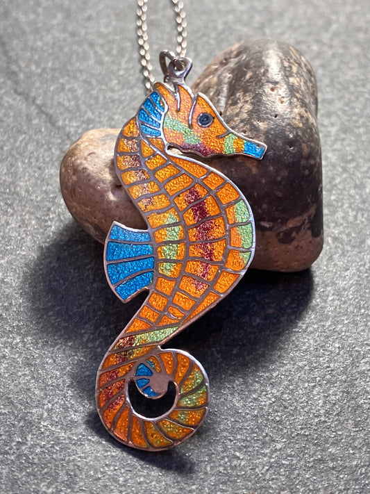 Vintage Sterling silver and enamel seahorse on original chain. Made by Ari D Norman