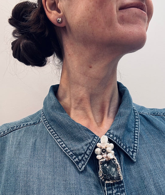 Unique handmade artisan pendant, a combination of Aquamarine crystal, pearls and sterling silver
