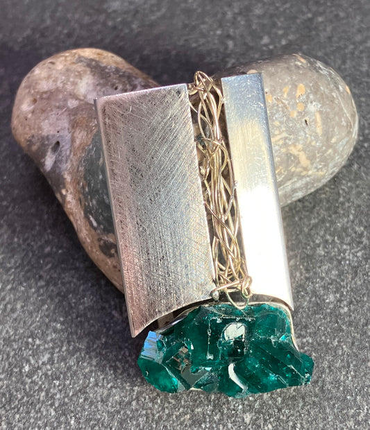 Unique vintage artisan sterling silver pendant with Green Tourmaline crystal.
