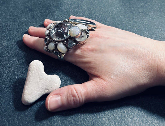 Spectacular Polish Artisan Double-Finger Ring. Sterling Silver, Rock Crystal, Topaz, Opals, Aquamarine & Pearls.