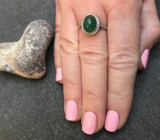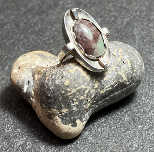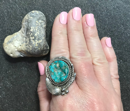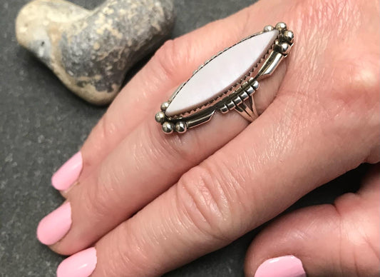 Vintage Native American sterling silver ring with mother of pearl set in a zig zag bezel setting.