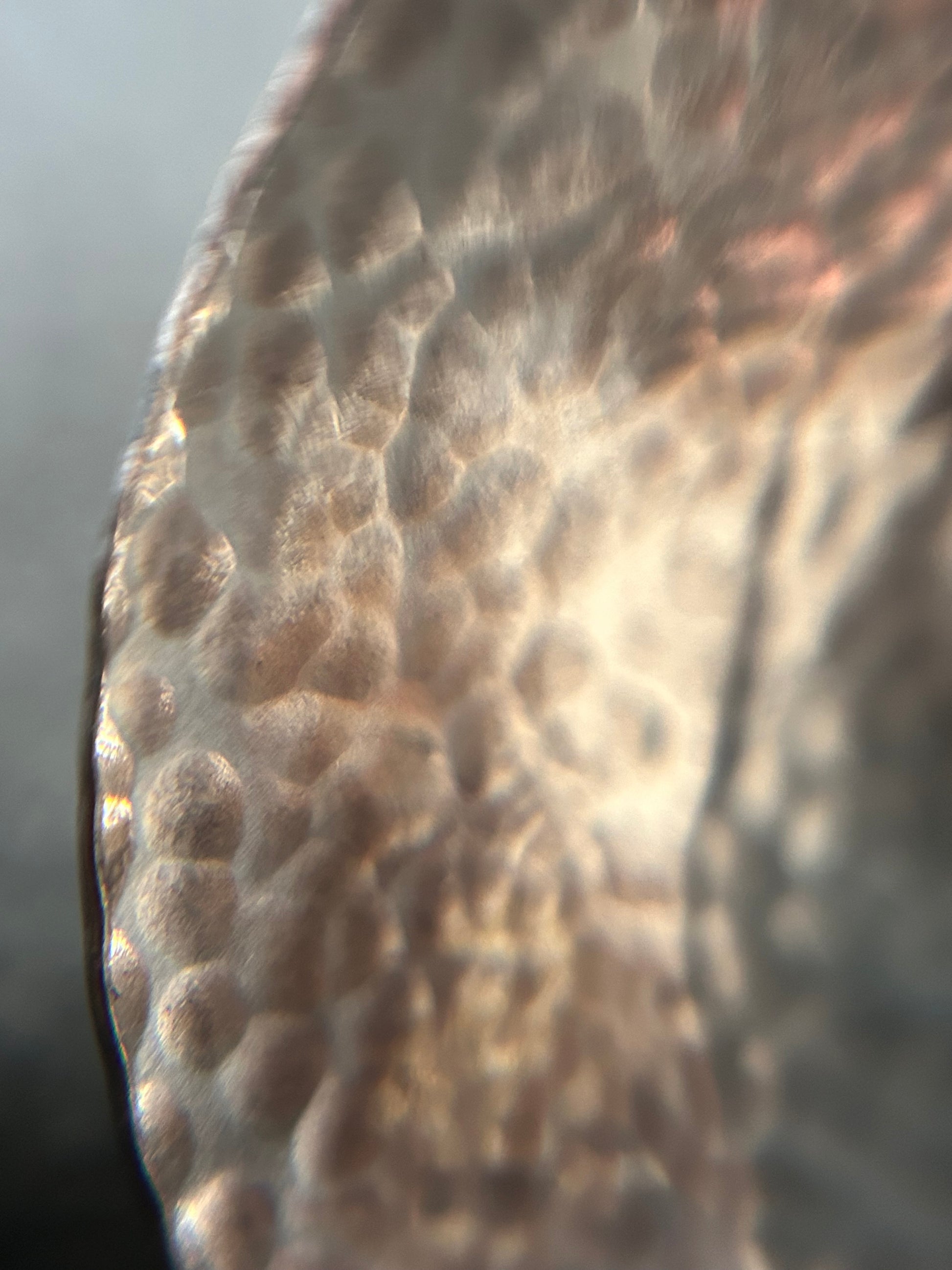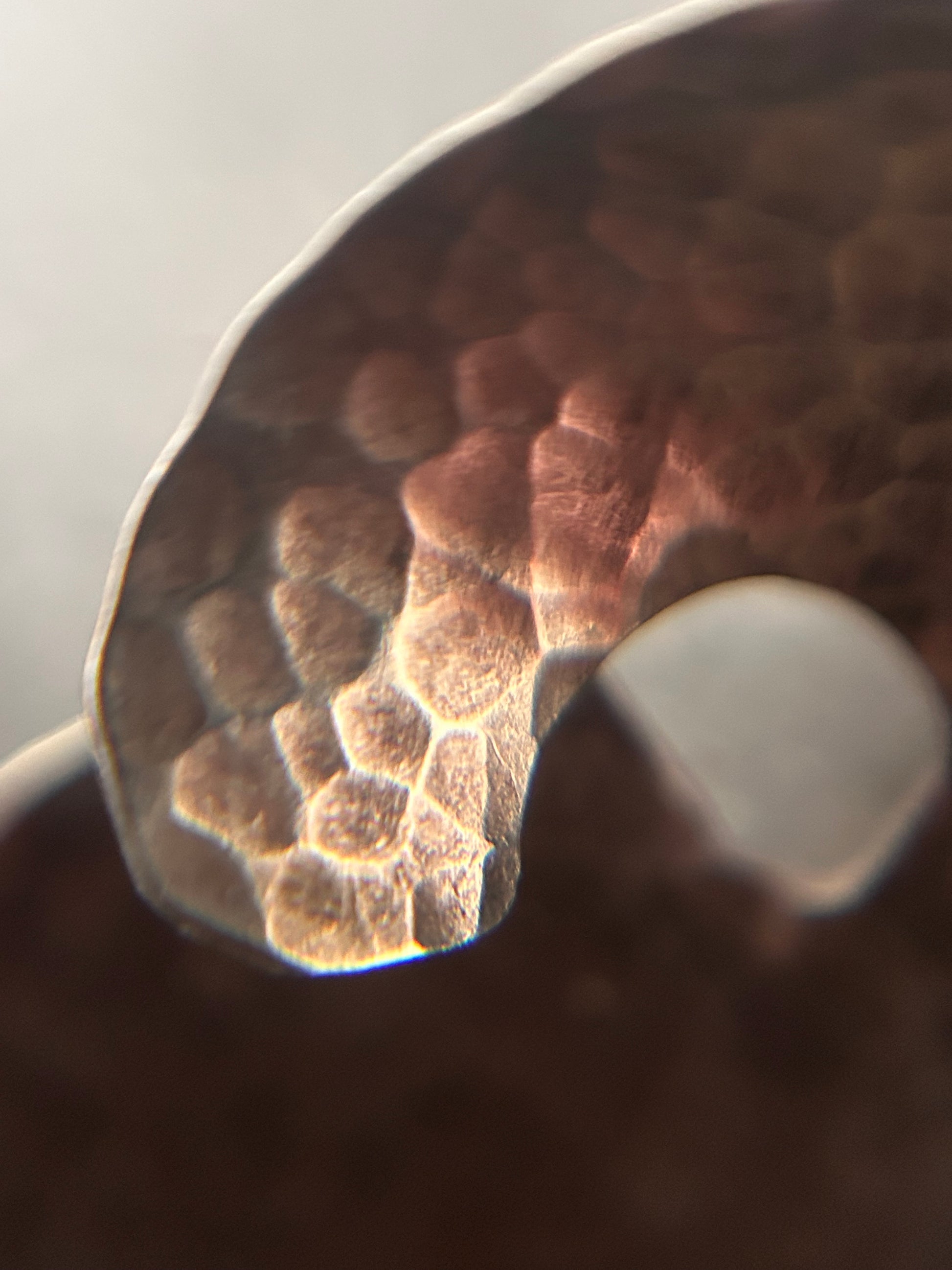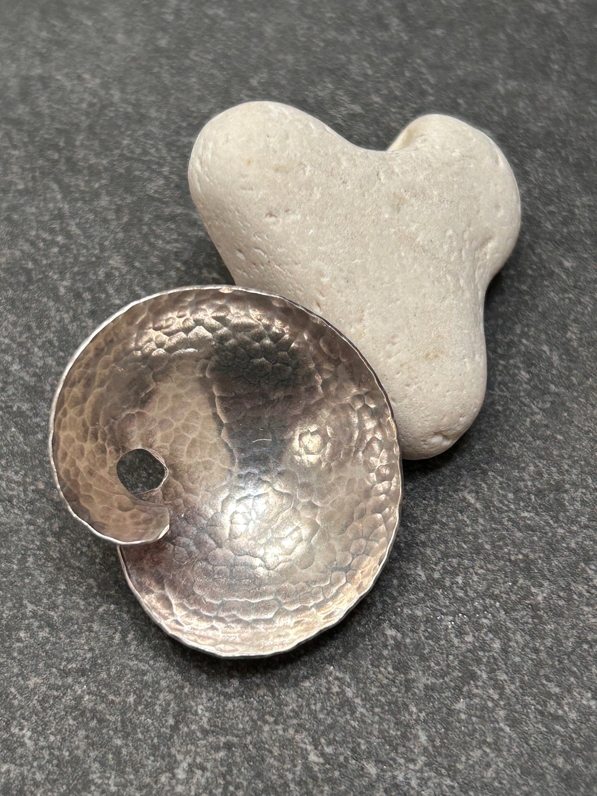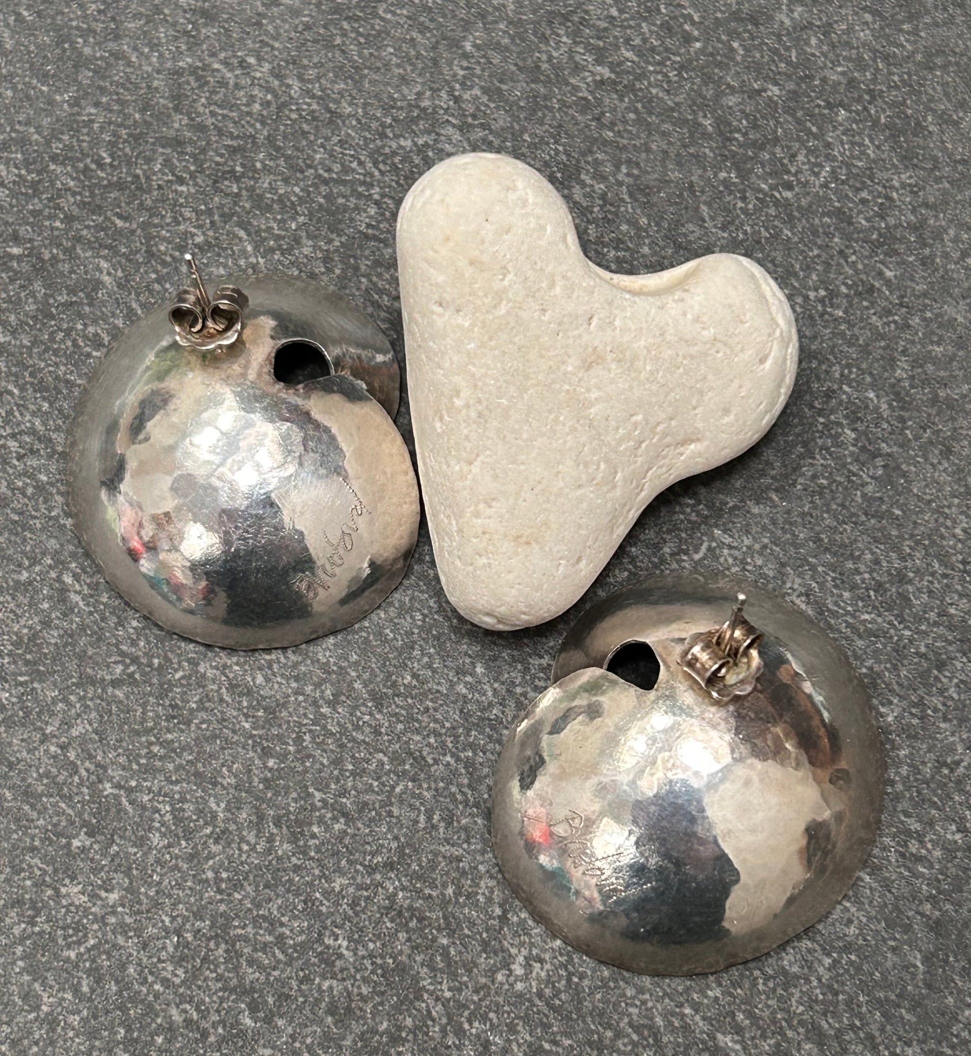 A striking pair of artisan-made vintage sterling silver earrings, beautifully concave in form with an elegant swirling design, crafted as a mirrored pair so they look exceptional when worn. The contrast between finishes is particularly appealing: the reverse is smoothly polished, while the front has been given a richly beaten texture, reminiscent of natural, organic surfaces, adding depth and character.