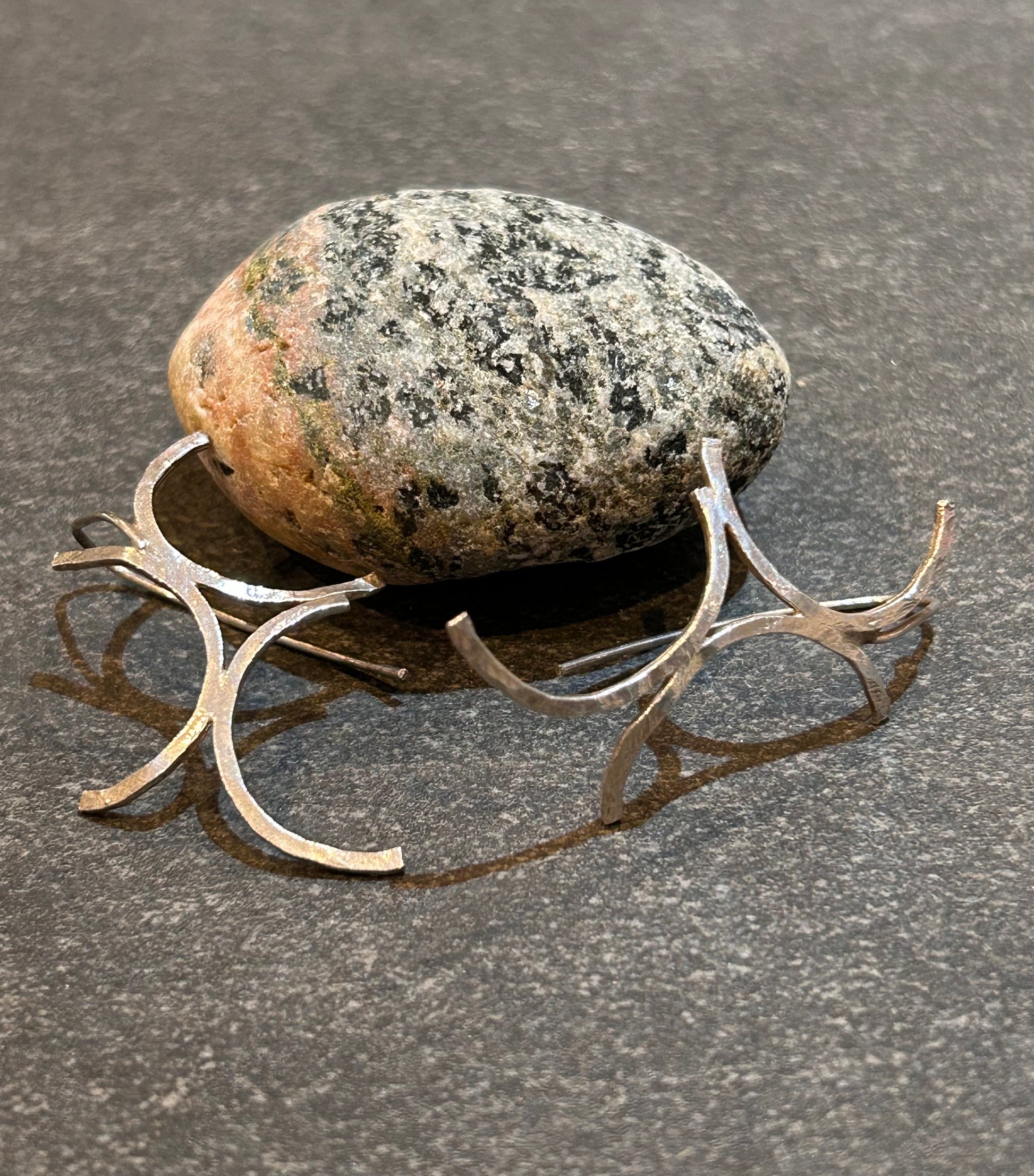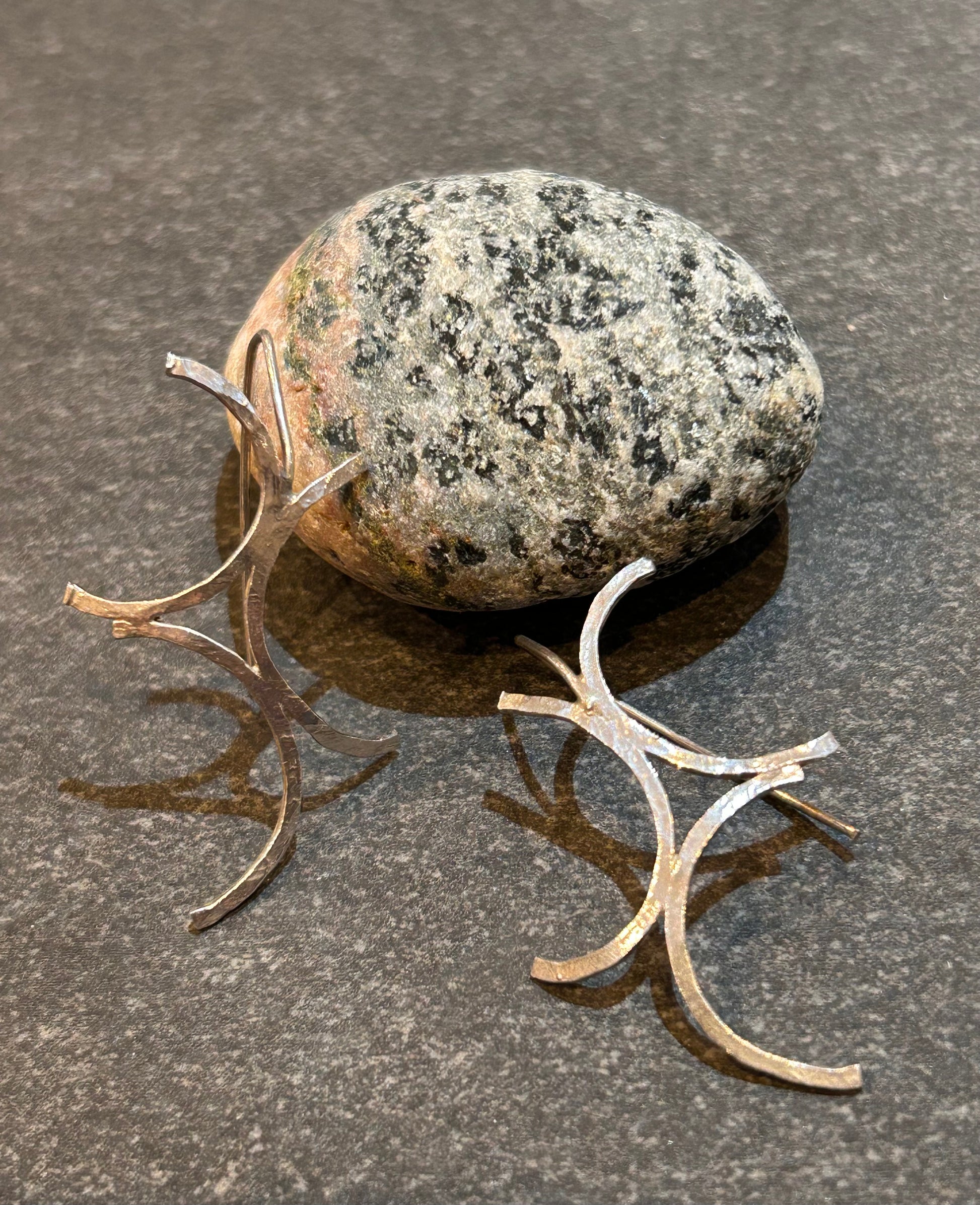 A truly timeless pair of artisan vintage sterling silver earrings, beautifully crafted with an understated elegance with a mirror image design. Each earring is formed from three gently curving arcs that meet in harmony, their surfaces finished with a subtle beaten texture that catches the light with delicate brilliance.