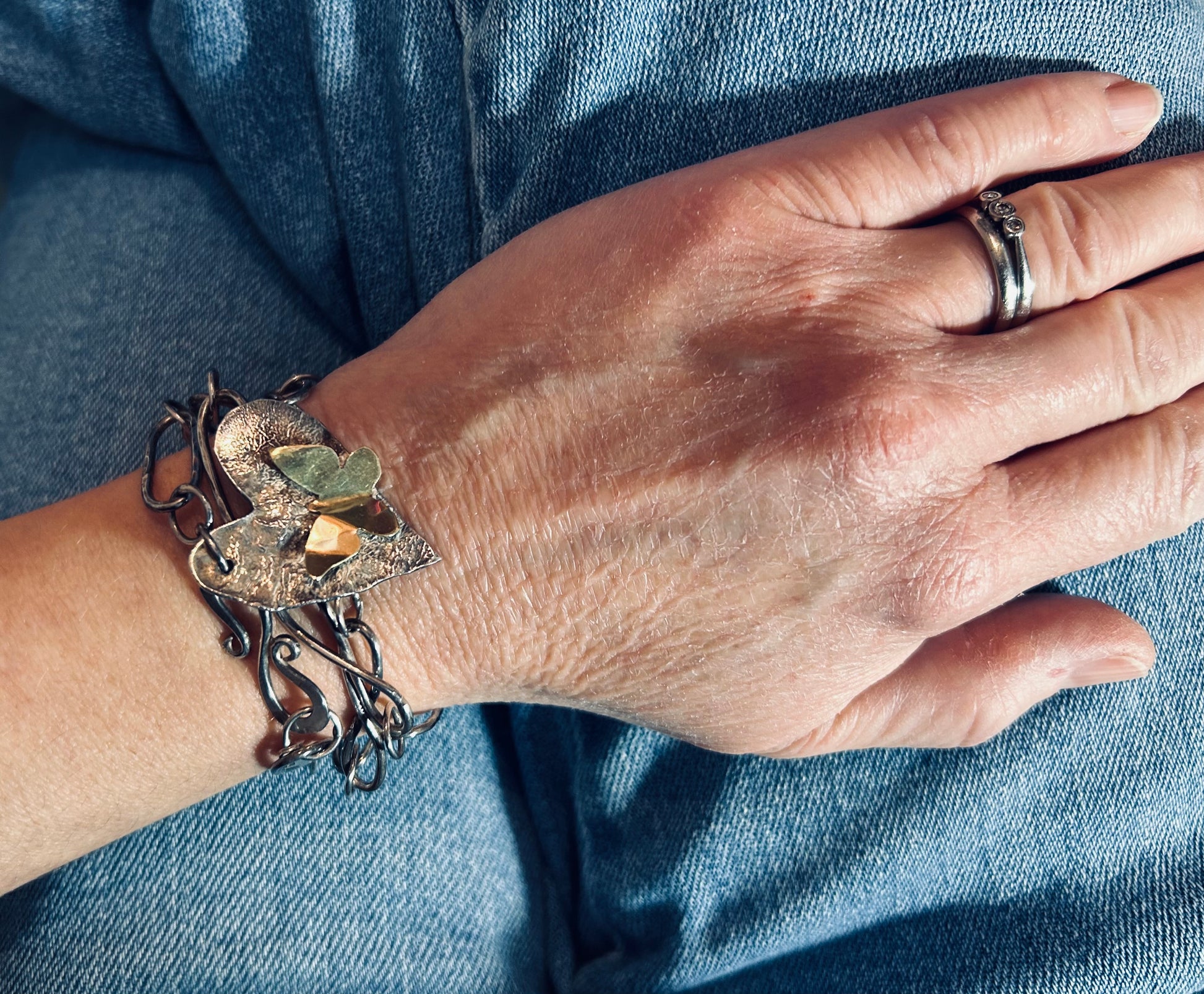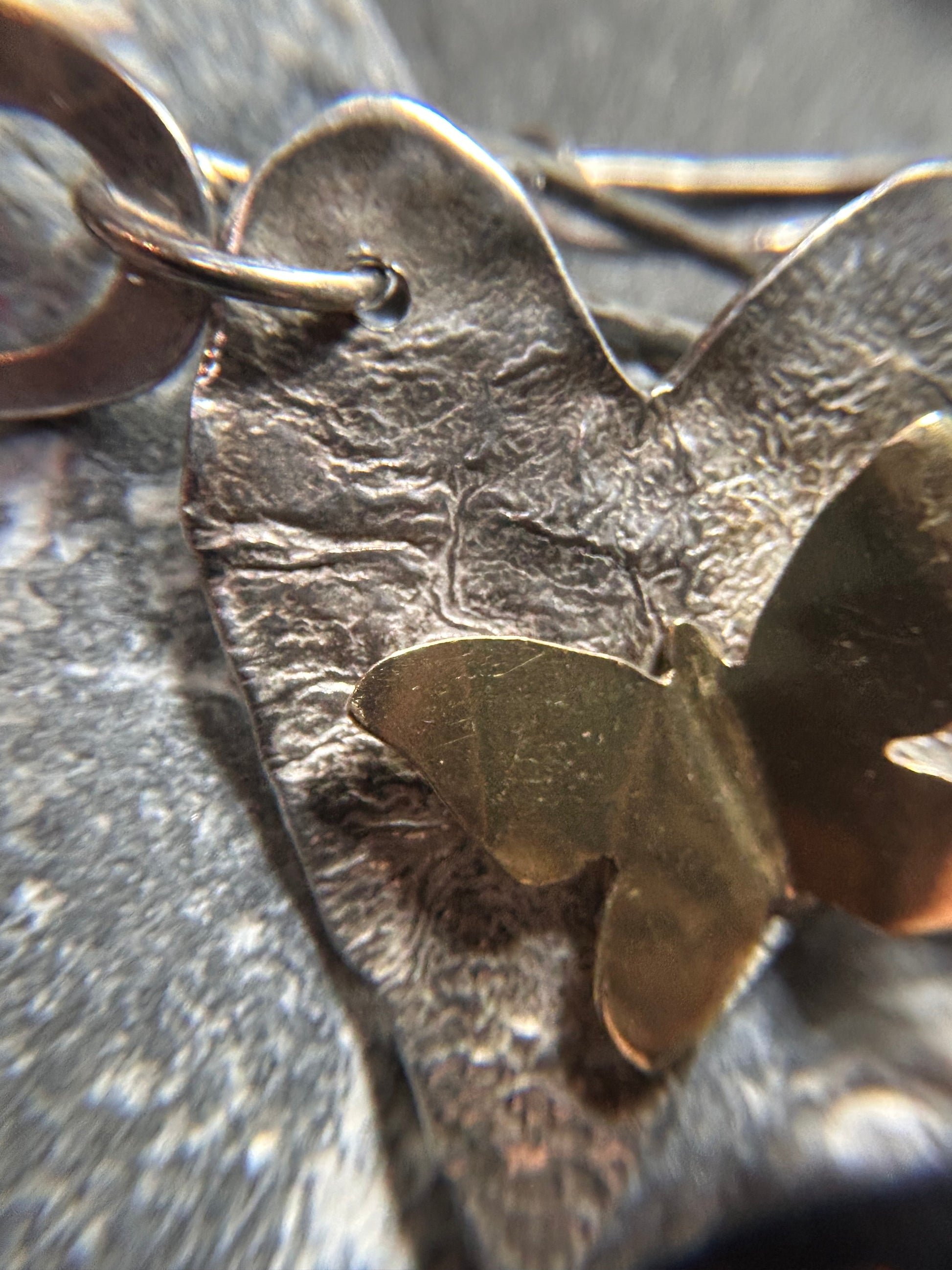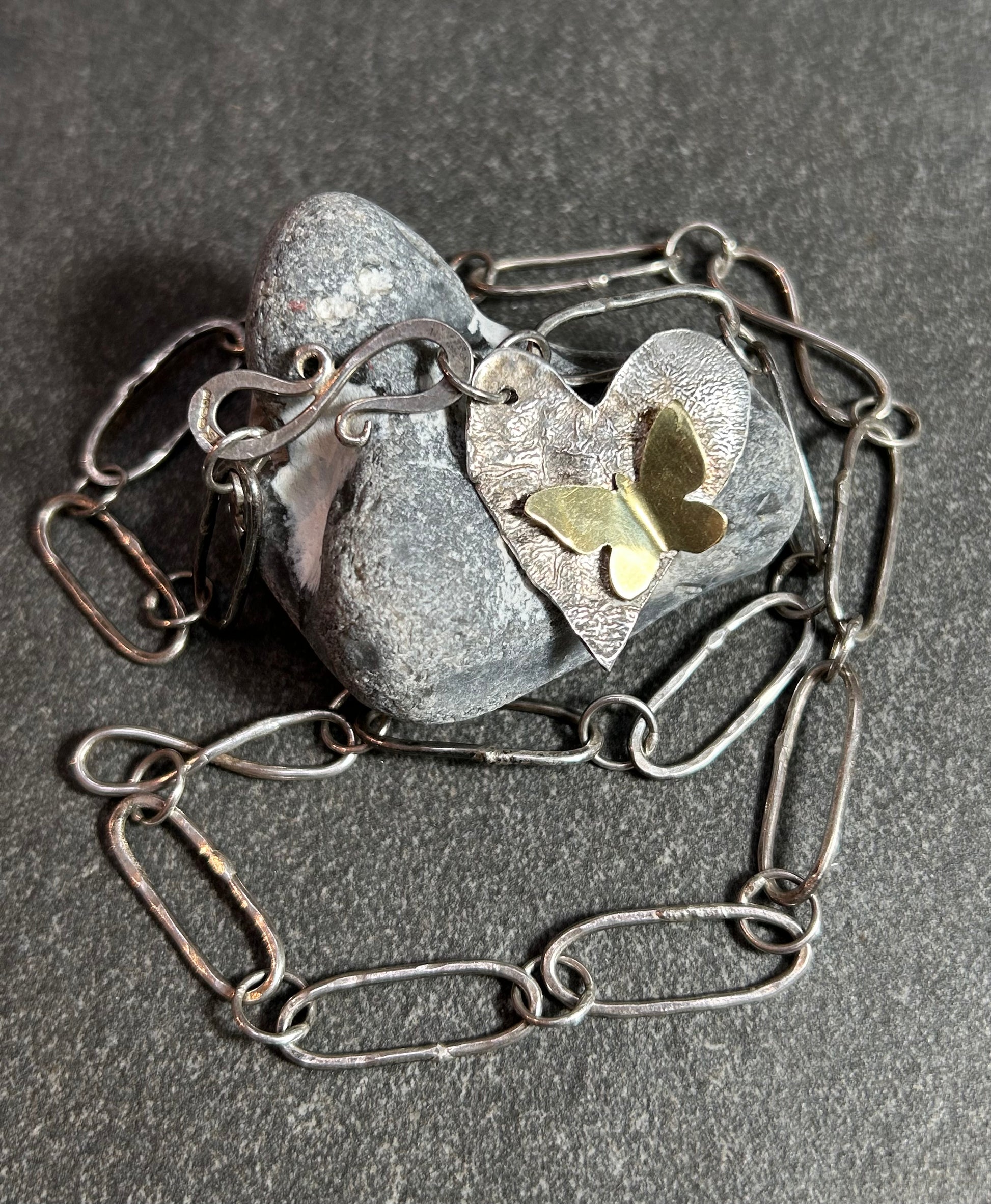 The chain leads to a wonderfully textured heart pendant, full of character and life, and perched upon it is a delicate brass butterfly, designed as though it has just alighted for a moment’s rest. The contrast of metals and textures creates a miniature tableau that draws the eye again and again.