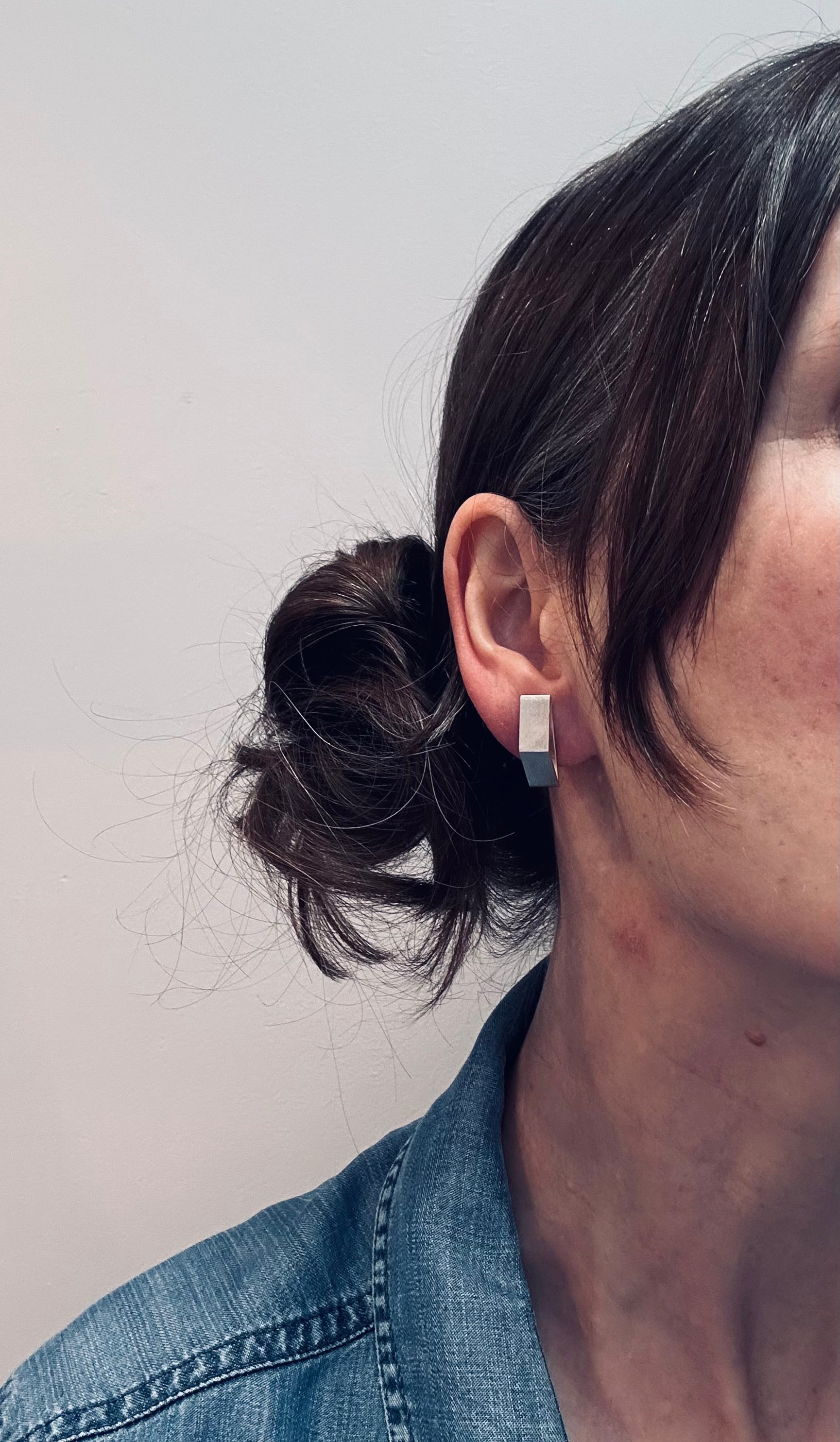 Showcasing a striking triangular geometric design that captures the essence of Scandinavian minimalism. Crafted in brushed sterling silver, the surface offers a soft, modern sheen that enhances their clean, elegant lines.