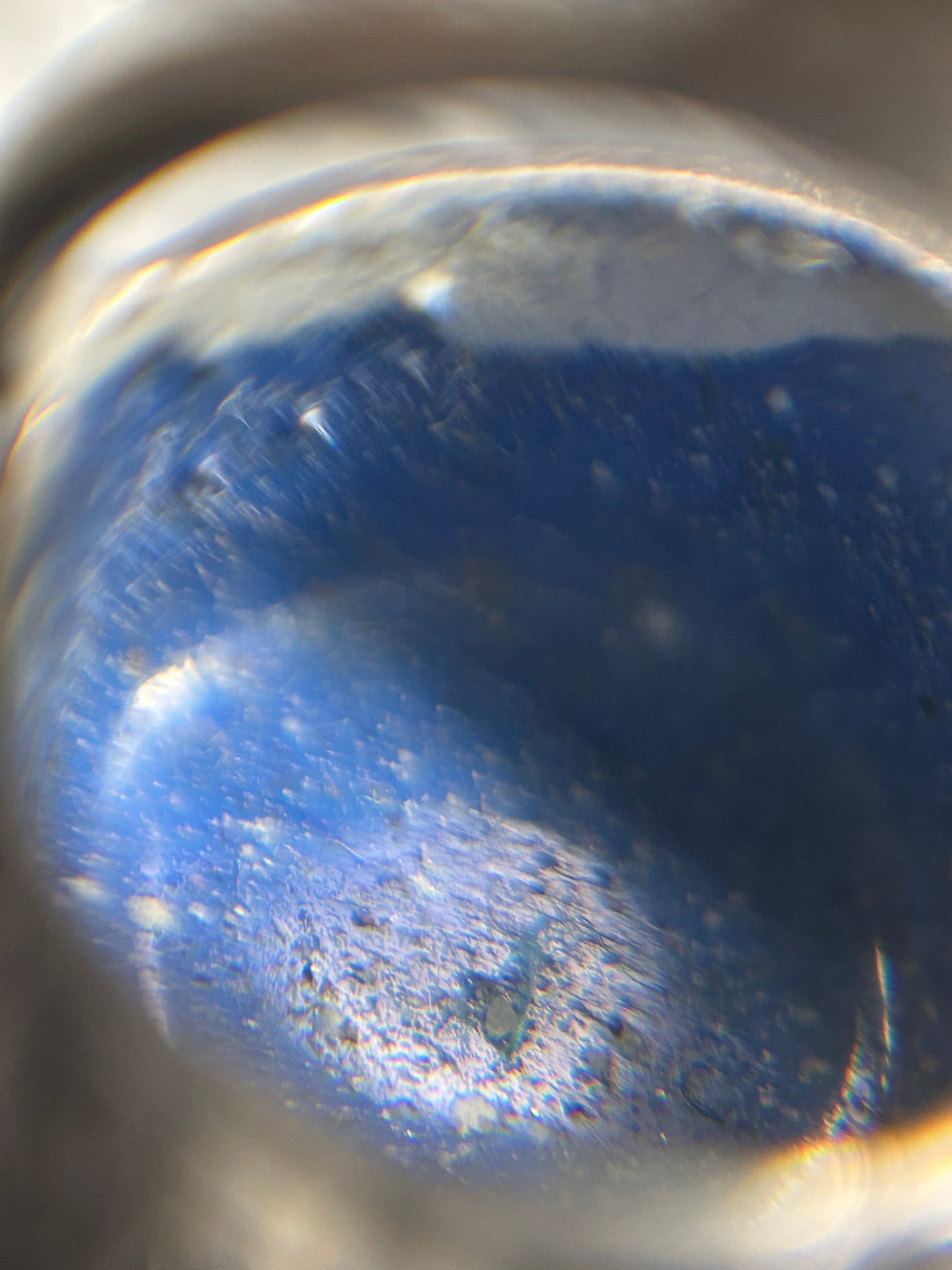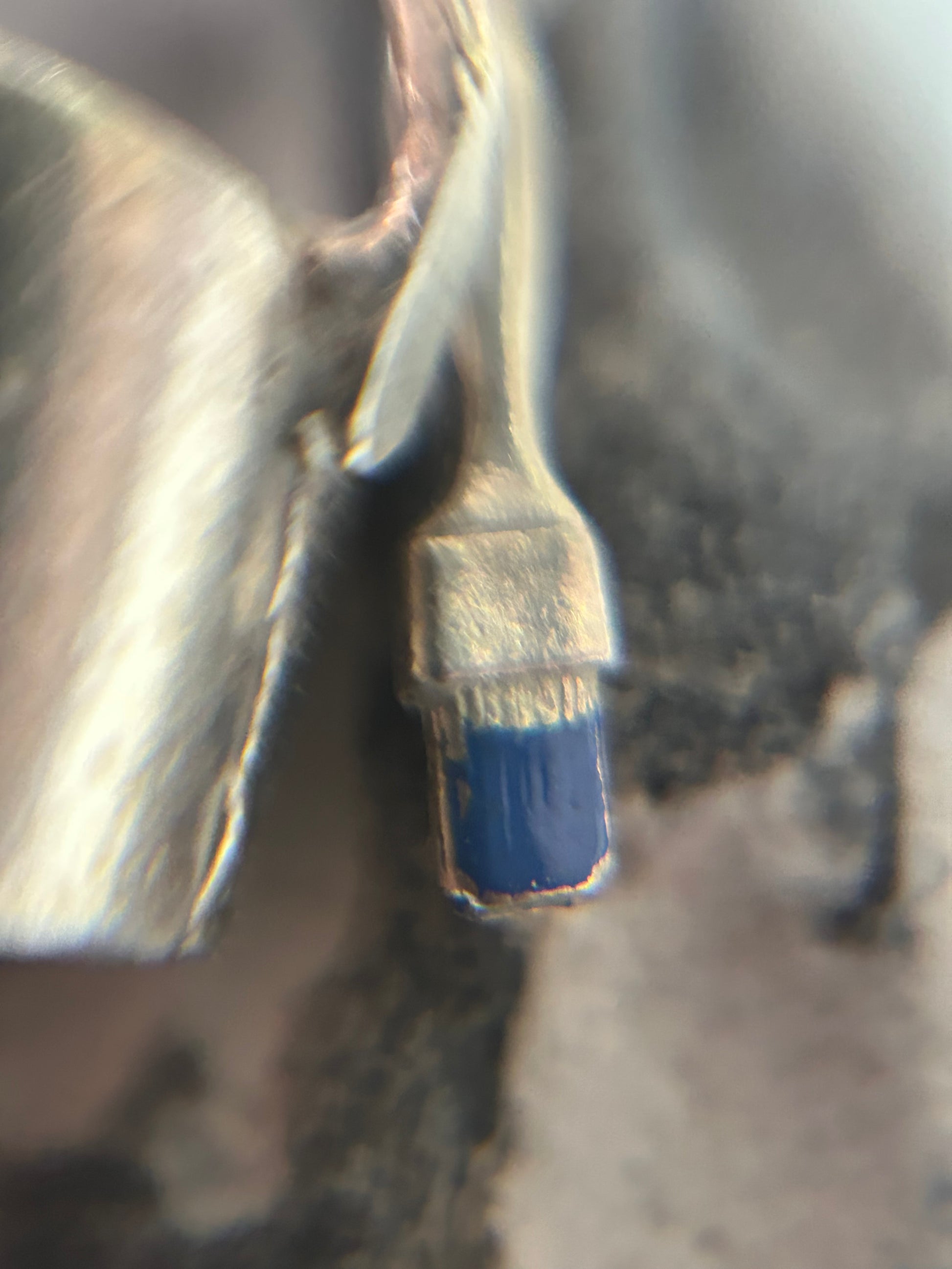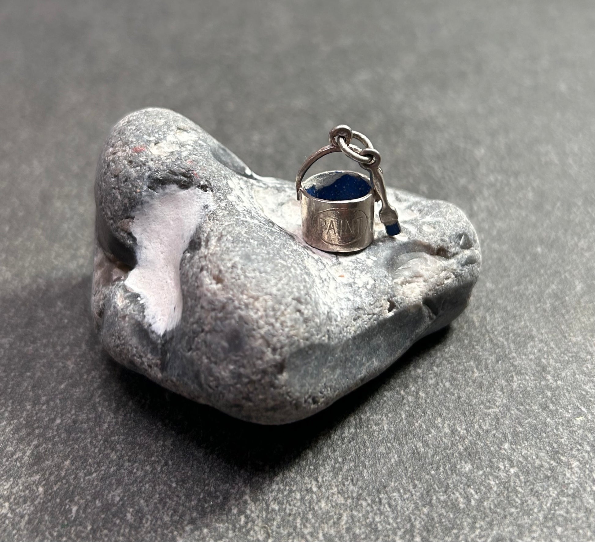 The miniature paint pot is exquisitely detailed, featuring the word “PAINT” engraved along its side and a glossy blue enamel finish inside the pot — as though freshly dipped in colour. The matching paint brush hangs gracefully accented with a touch of the same blue enamel at its tip, completing the look of an artist mid-creation.
