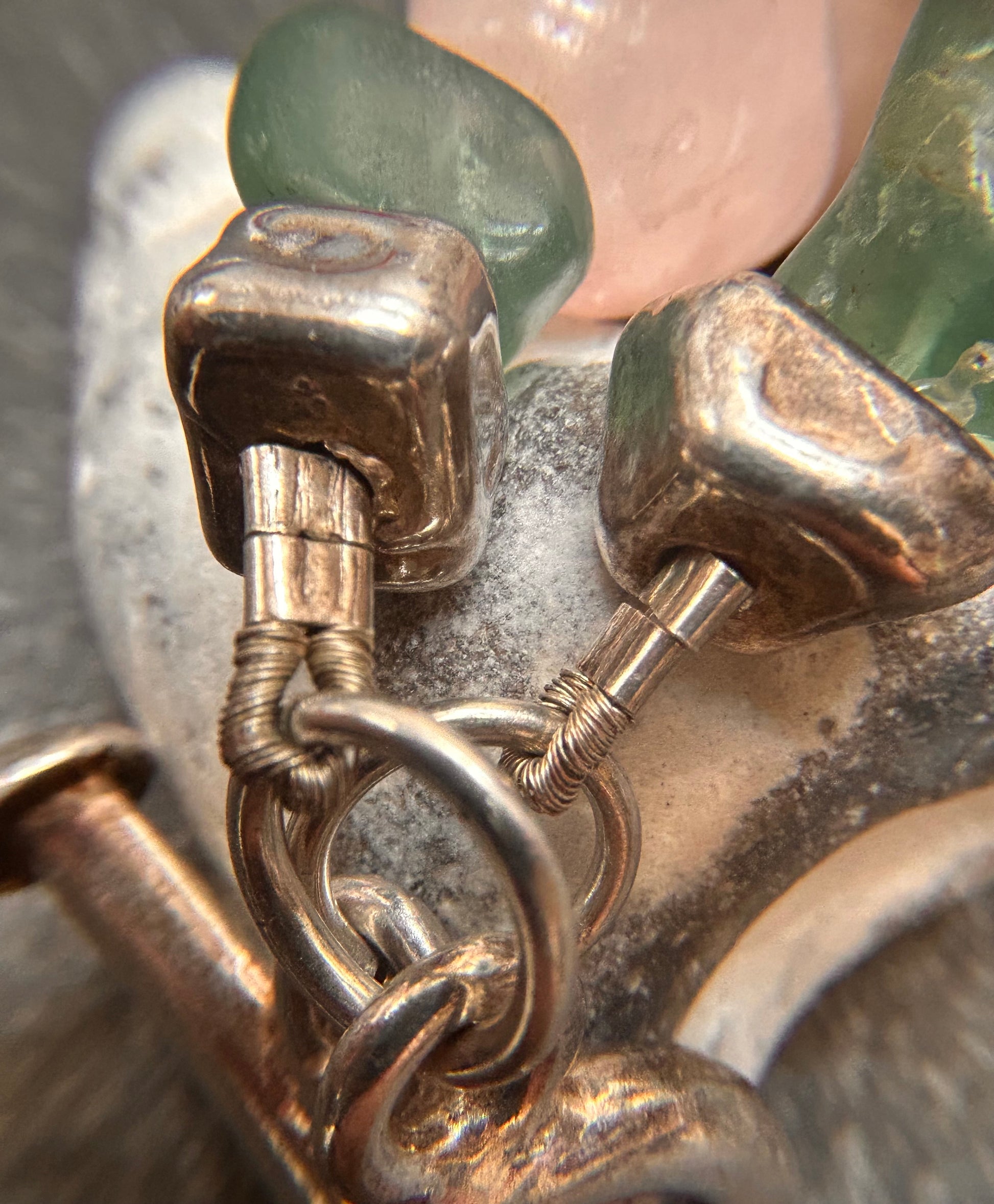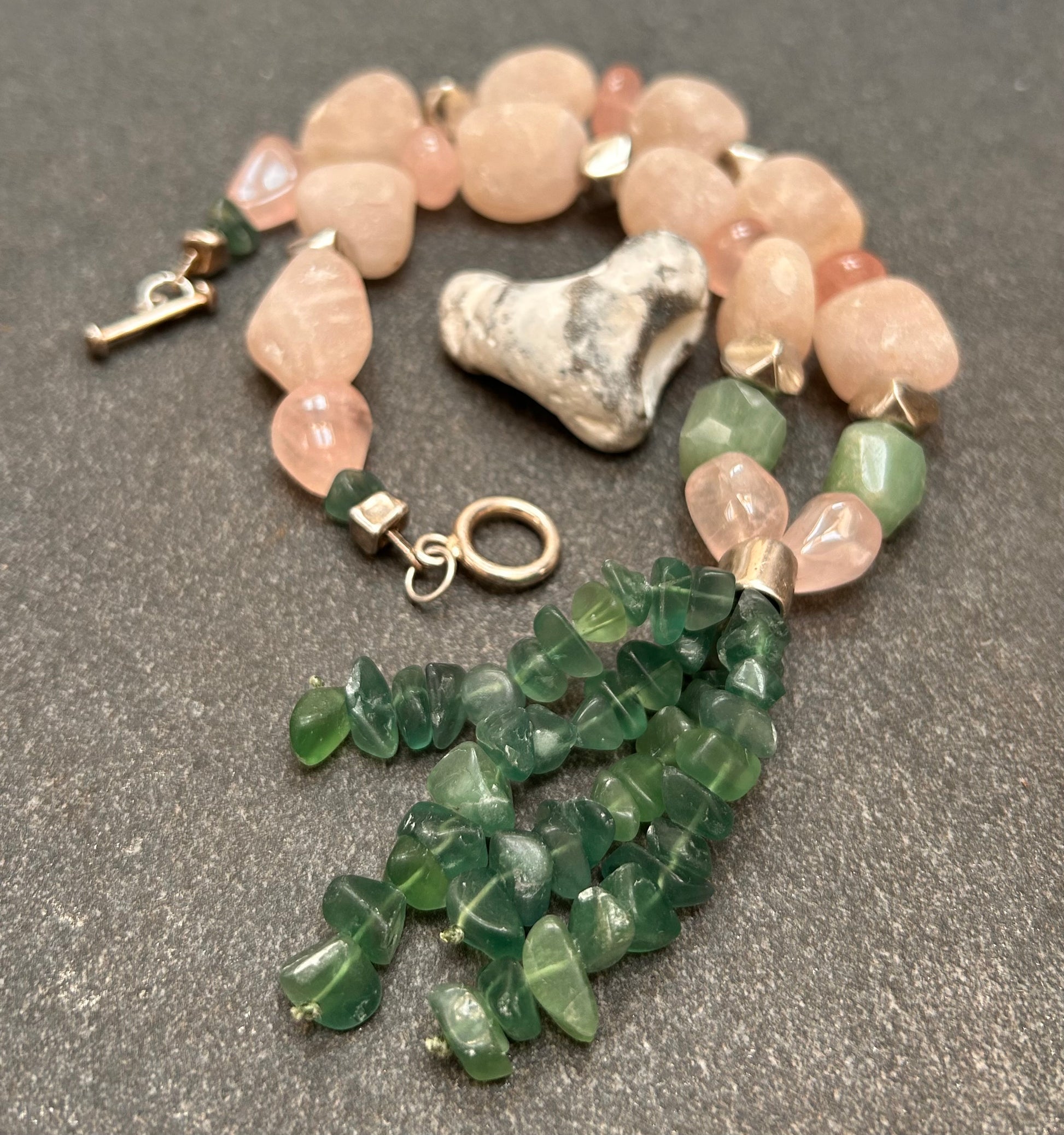 Featuring a stunning combination of green chalcedony and soft blush rose quartz, each stone brings its own unique energy—some polished to a luminous glow, others left in their raw, organic form for a beautifully textured contrast.
