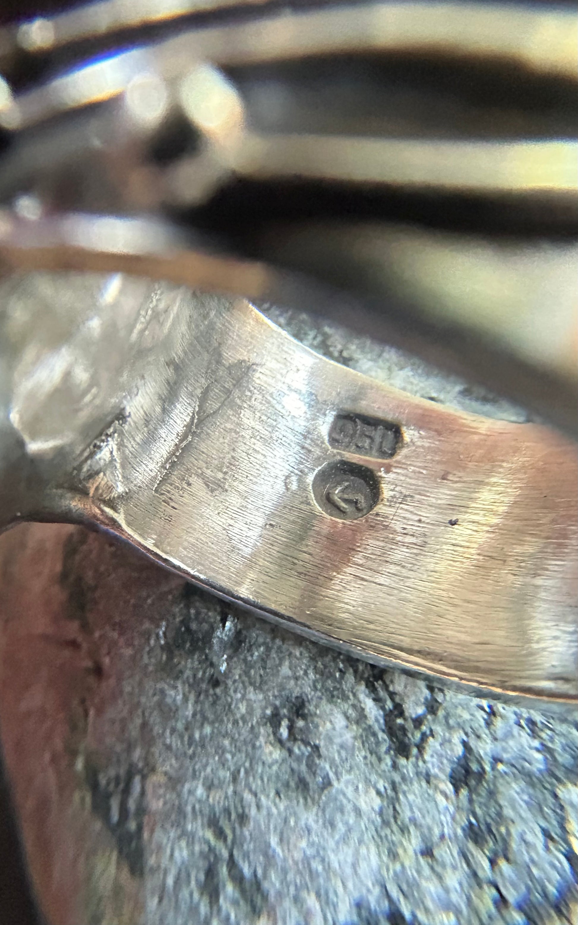 Crafted in 950 sterling silver—often associated with French or Mexican silversmithing—the piece carries a higher silver purity than standard sterling, offering both quality and character. With its earthy yet sophisticated design, this unique ring feels both timeless and deeply personal, perfect for anyone drawn to jewelry that tells a story.