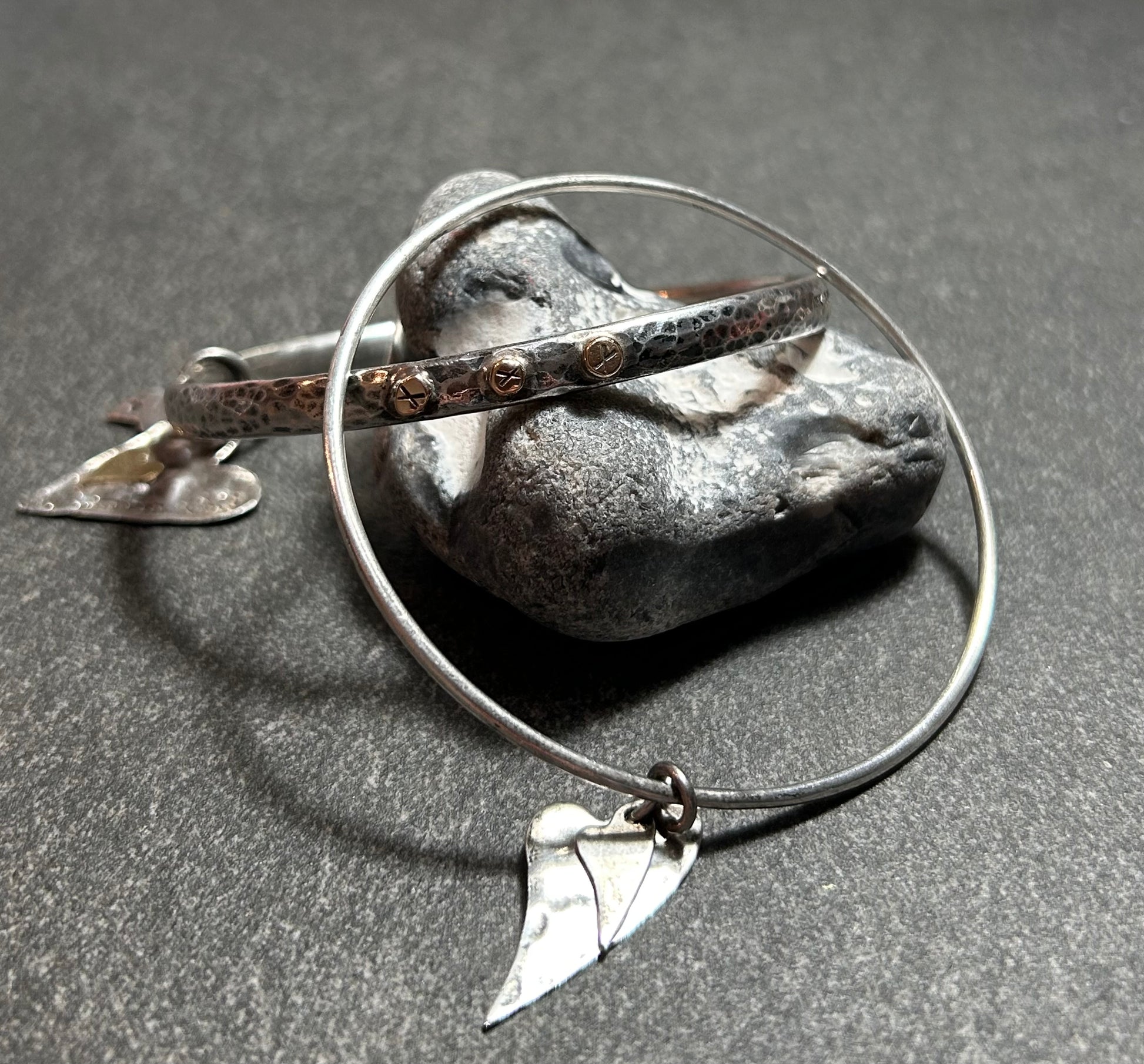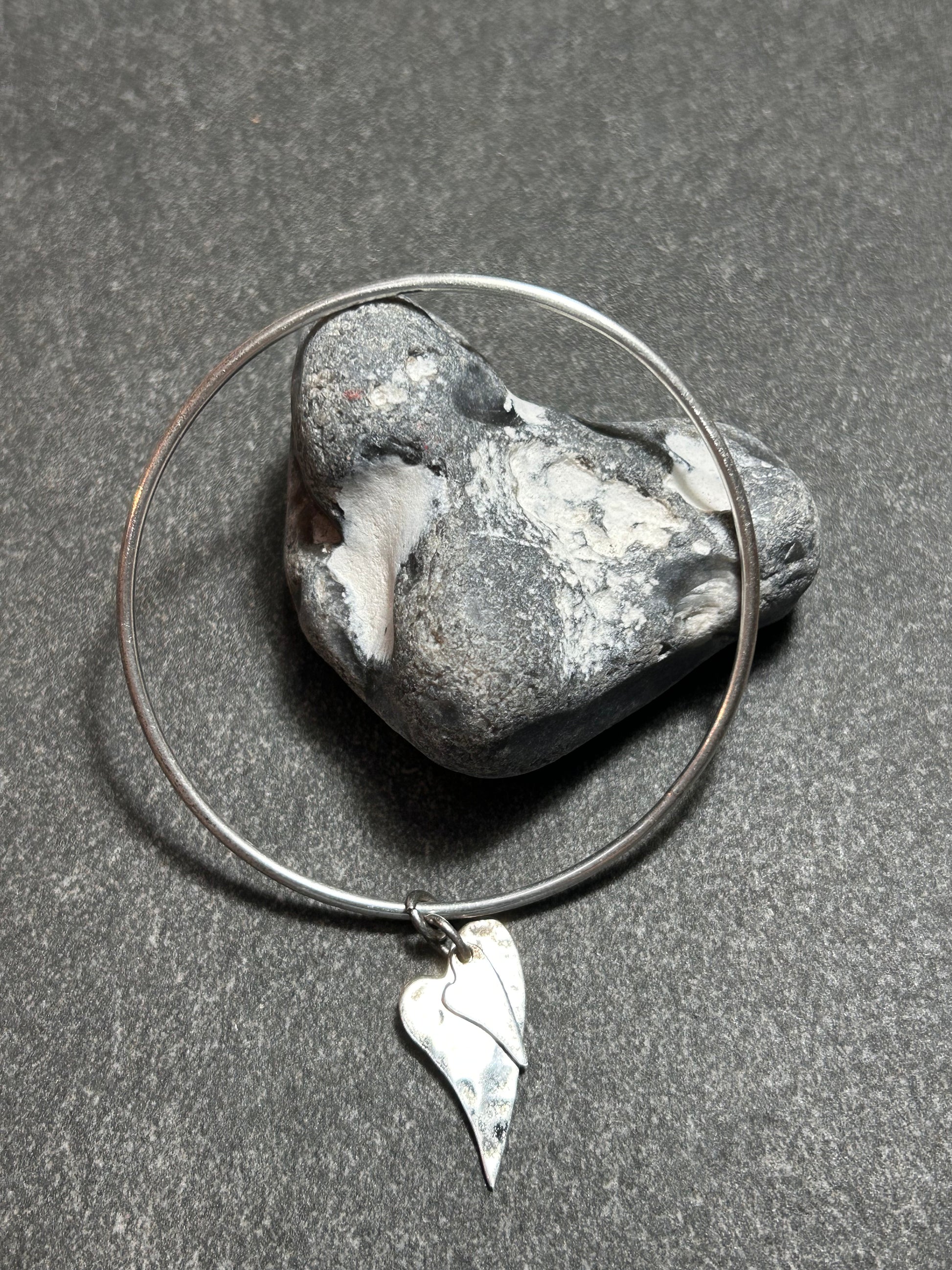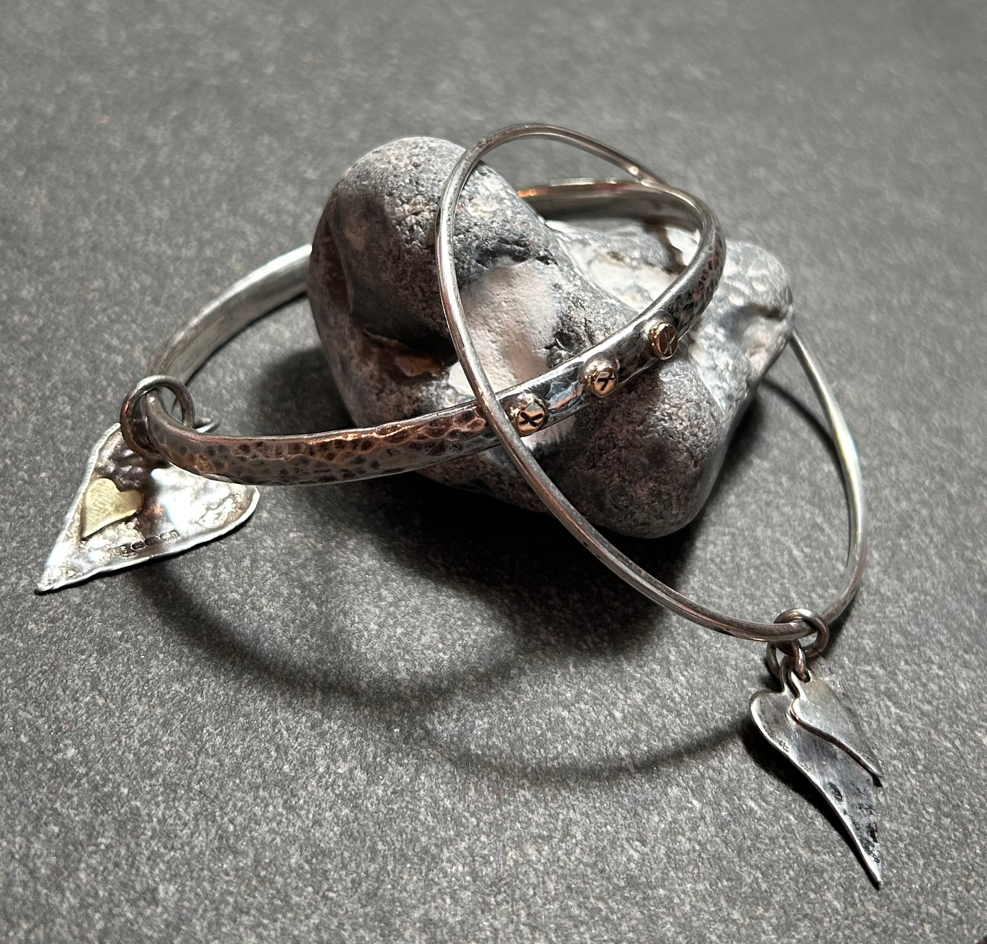 This listing is for the delicate companion piece adorned with two small silver hearts. It pairs beautifully with the larger bangle but can also be worn on its own or added to an existing stack.