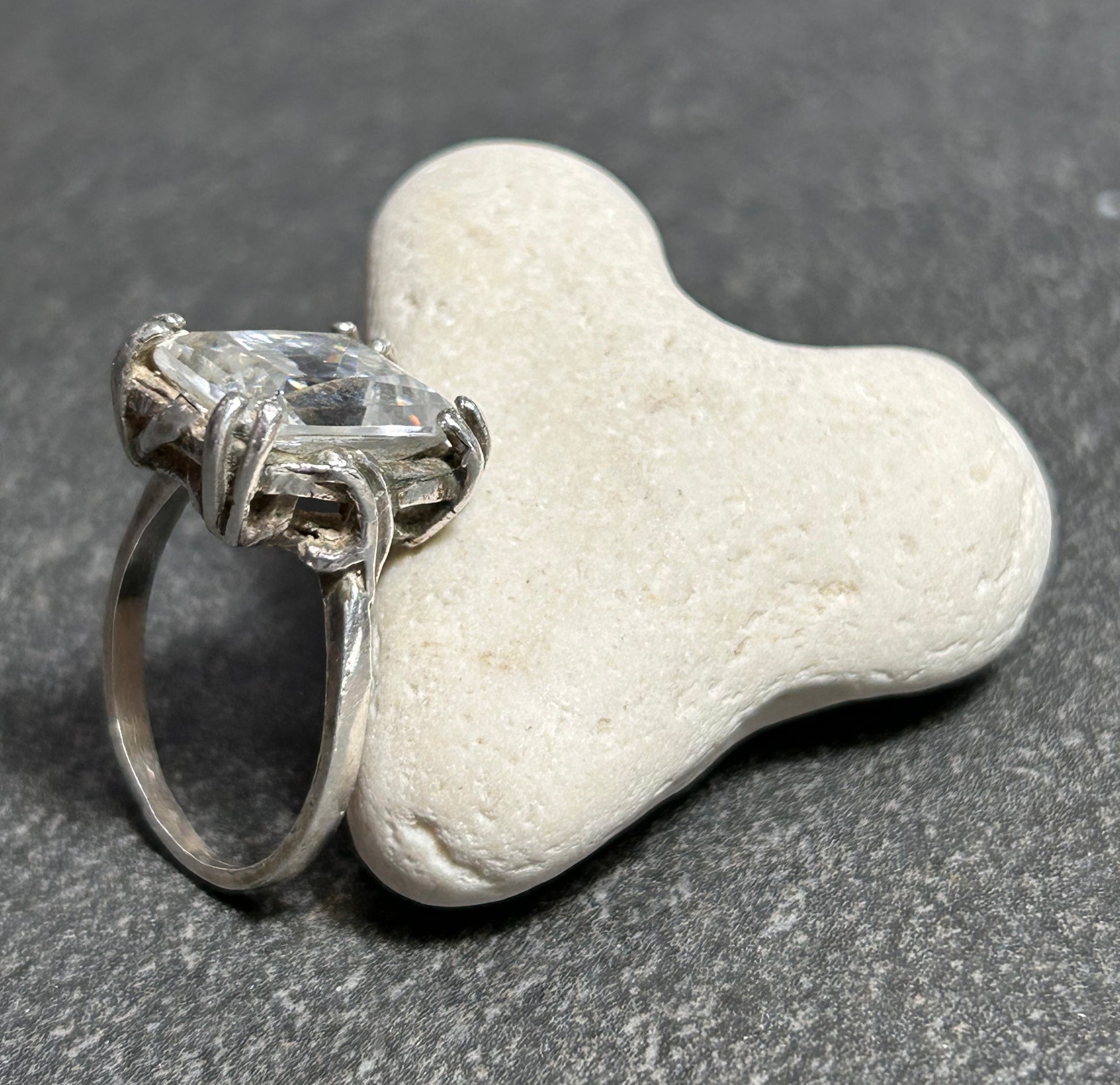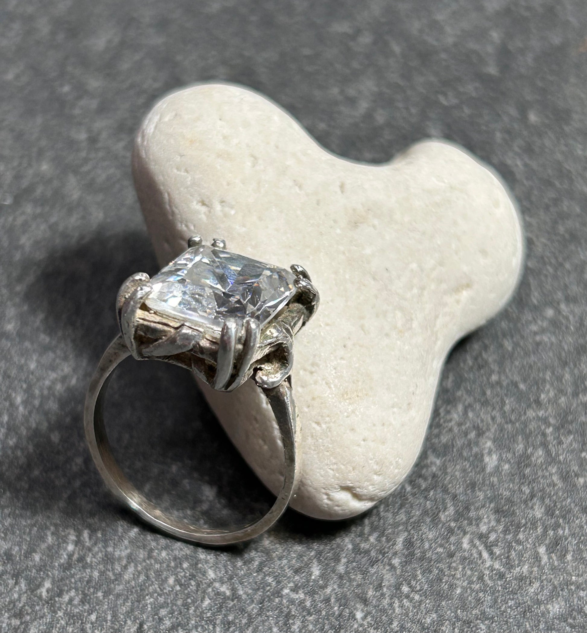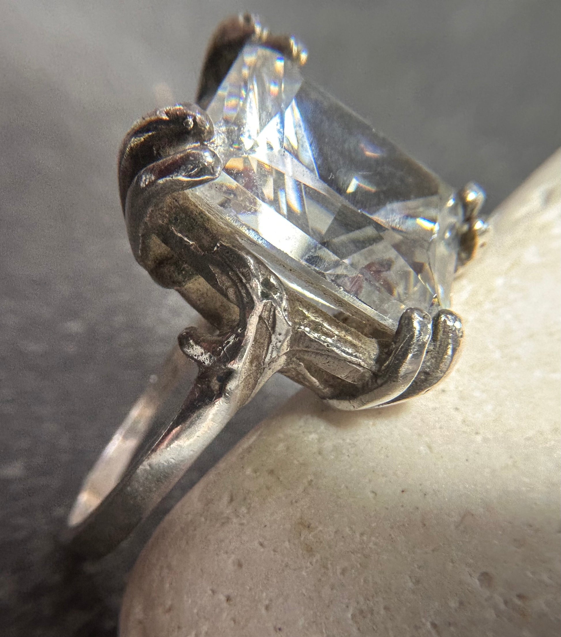 This vintage Polish ring is crafted in sterling silver and set with a beautifully cut rectangular quartz crystal that truly comes to life in the light. The stone’s exceptional faceting captures and refracts light exquisitely, revealing flashes of delicate rainbow colours with every movement.
