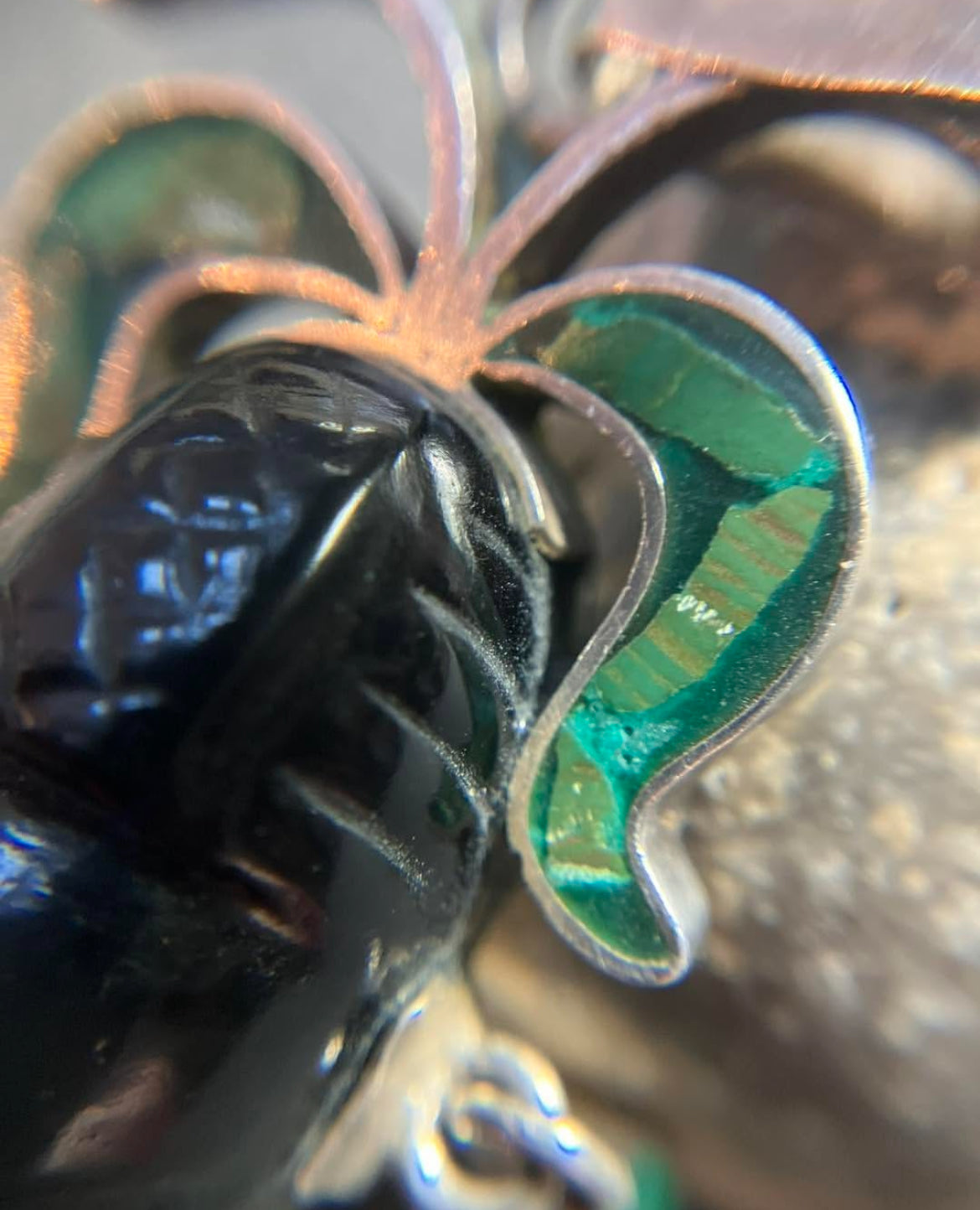 The face is exquisitely hand-carved from onyx, capturing a serene, contemplative expression. The headdress and collar are beautifully inlaid with vibrant malachite chips, set within a detailed silver surround that highlights the artisan craftsmanship of mid-20th century Mexican jewelry.