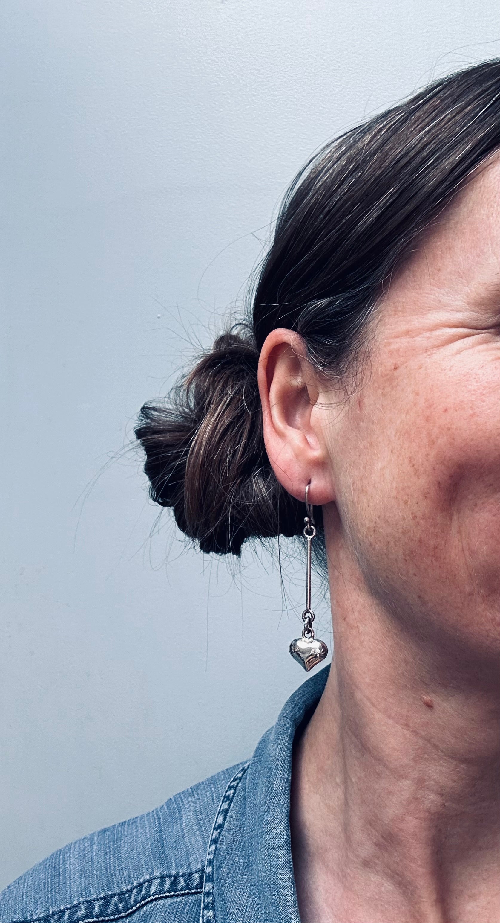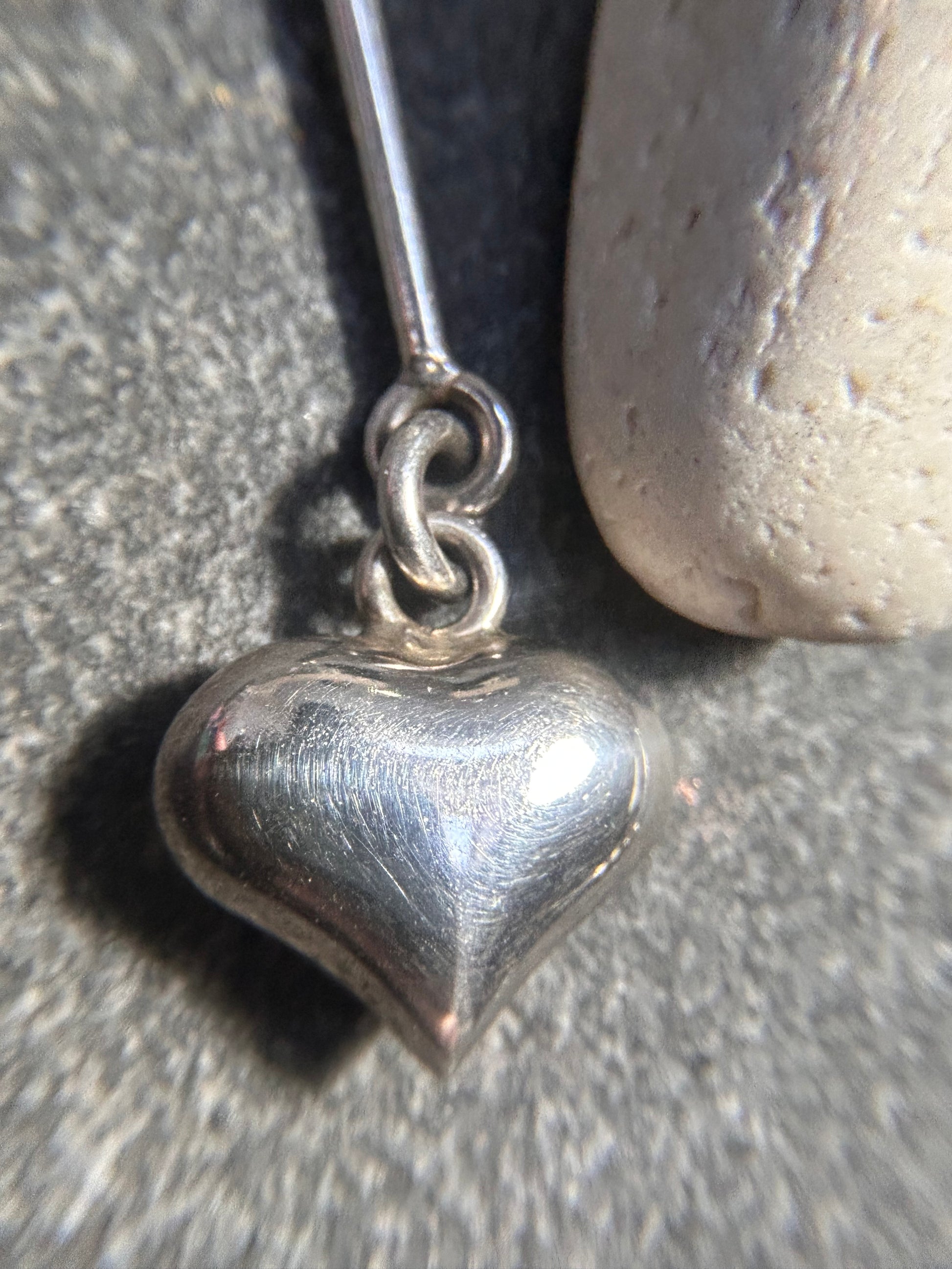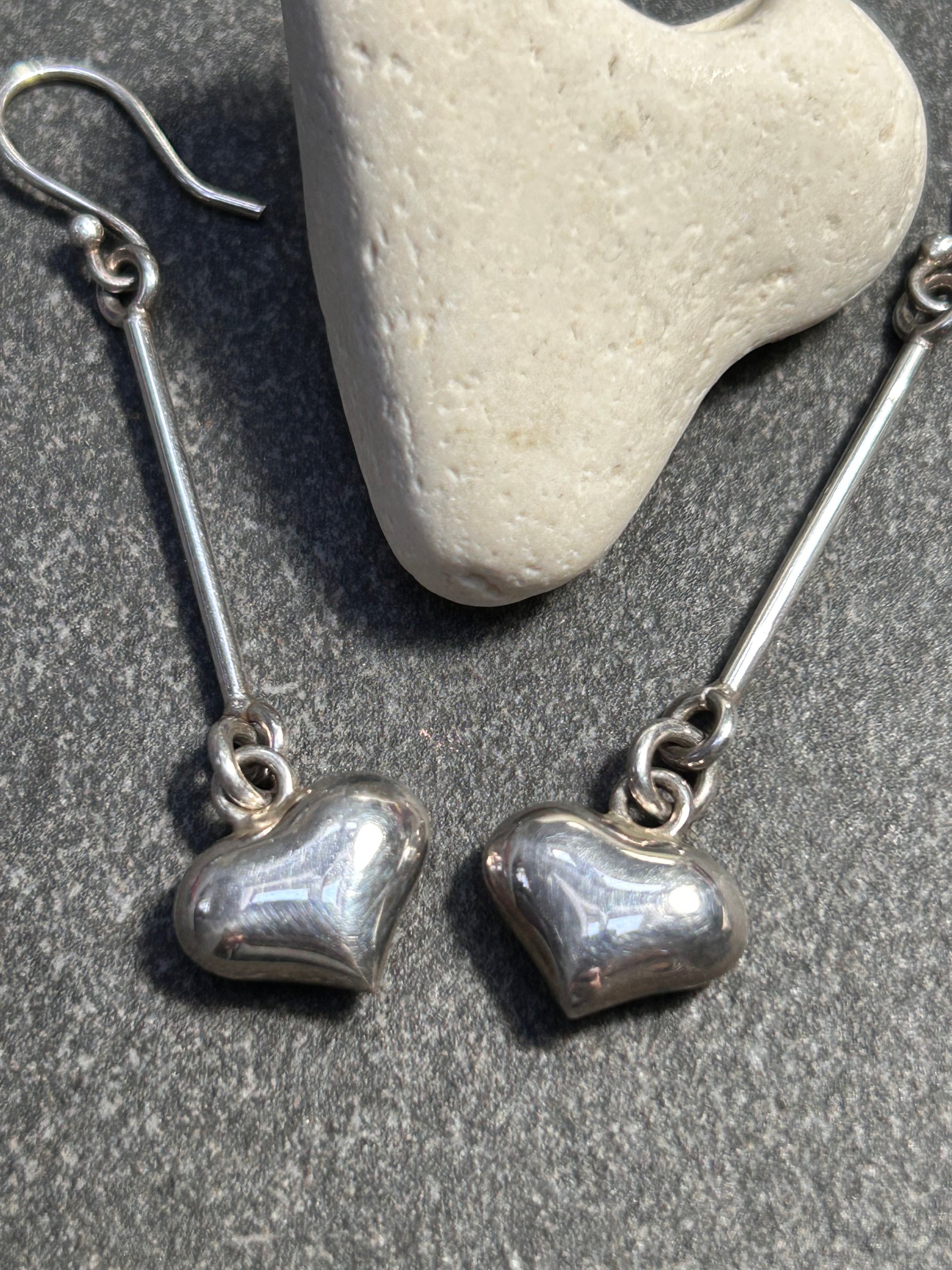 These elegant vintage earrings feature a beautifully sculpted three-dimensional puffed heart suspended from a slender, elongated bar—creating graceful movement and a timeless minimalist silhouette when worn. Crafted in unmarked but tested sterling silver, they offer the soft gleam and warmth characteristic of quality vintage silver.