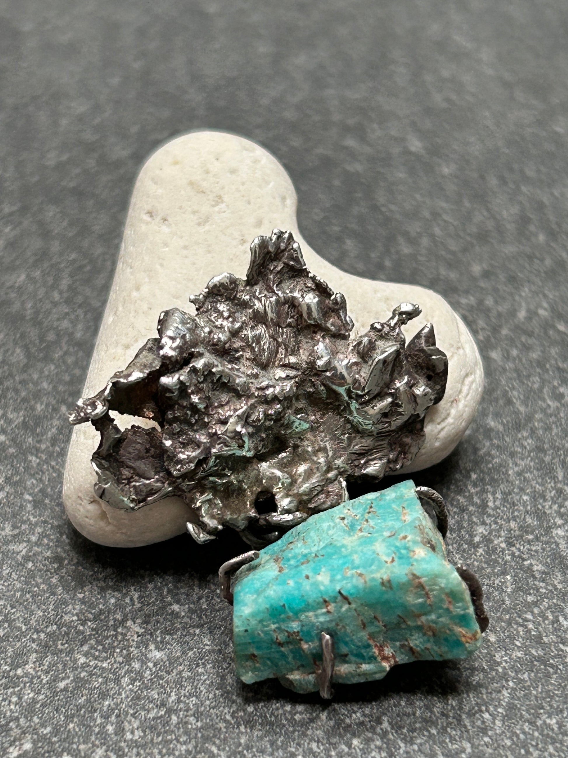 Suspended below is a stunning raw-cut piece of amazonite, adding a beautiful sense of movement and a touch of natural elegance.