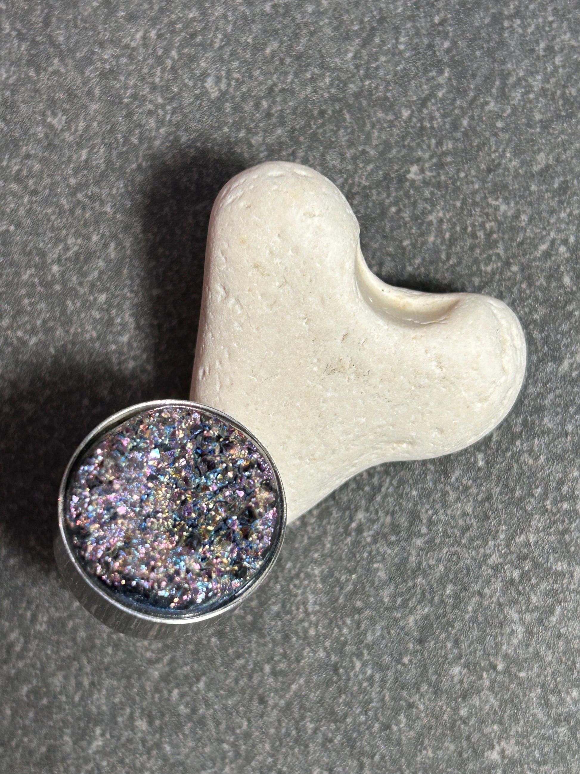 This vintage sterling silver ring features a mesmerising Aurora Quartz centre stone that shimmers with a full spectrum of colour—peacock blues, greens, purples, and subtle hints of gold. Its organic, undulating surface reveals every crystalline facet, catching the light from every angle for an unforgettable display.