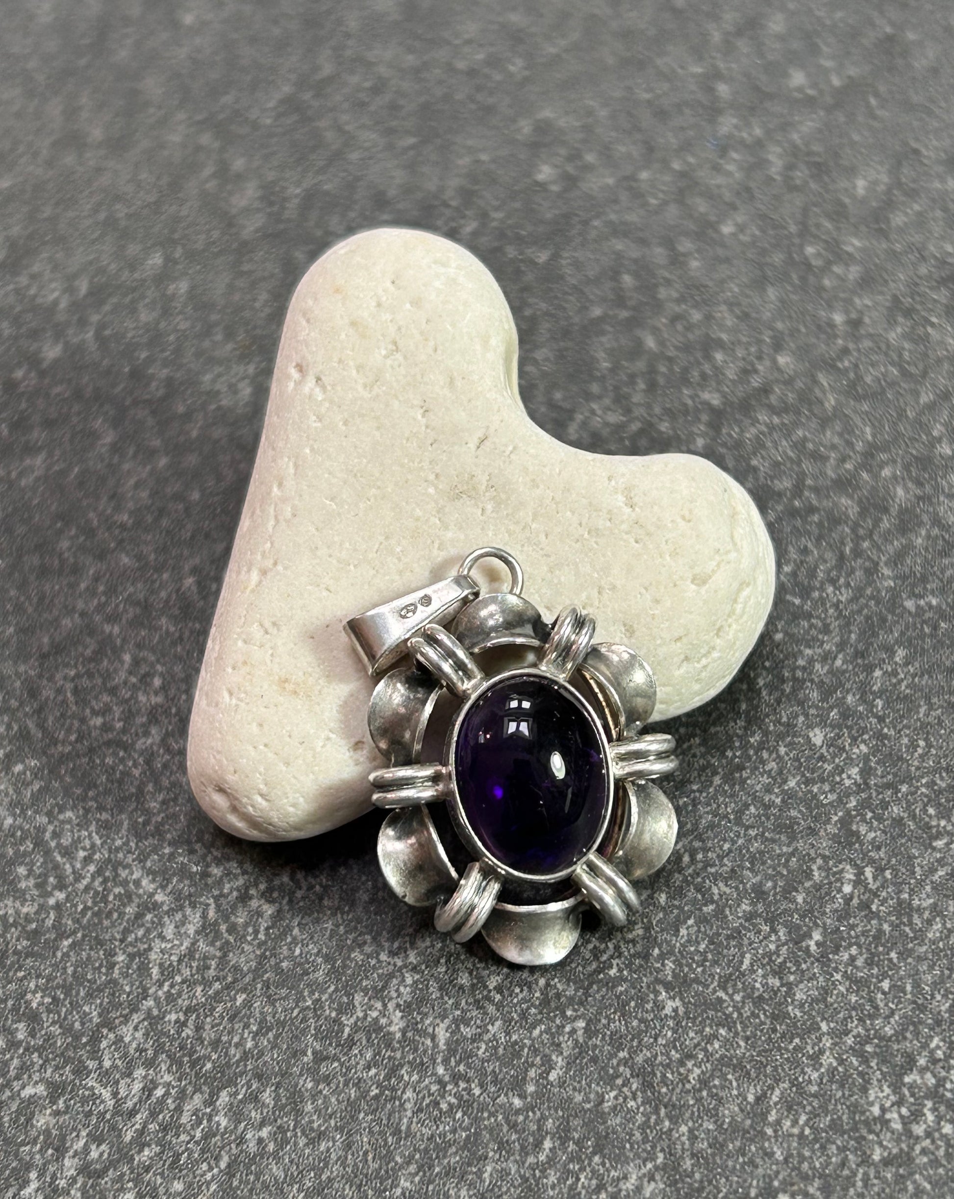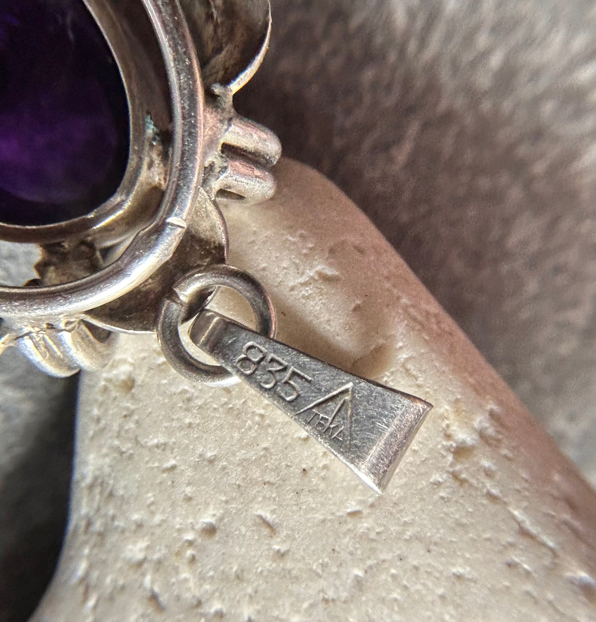 At its center sits a rich, deep amethyst cabochon—smoothly polished, glowing with natural depth, and beautifully captured in the photos. Surrounding the stone is a delicate sterling silver border, full of graceful curvework and gentle movement, a signature of Teka’s refined style.